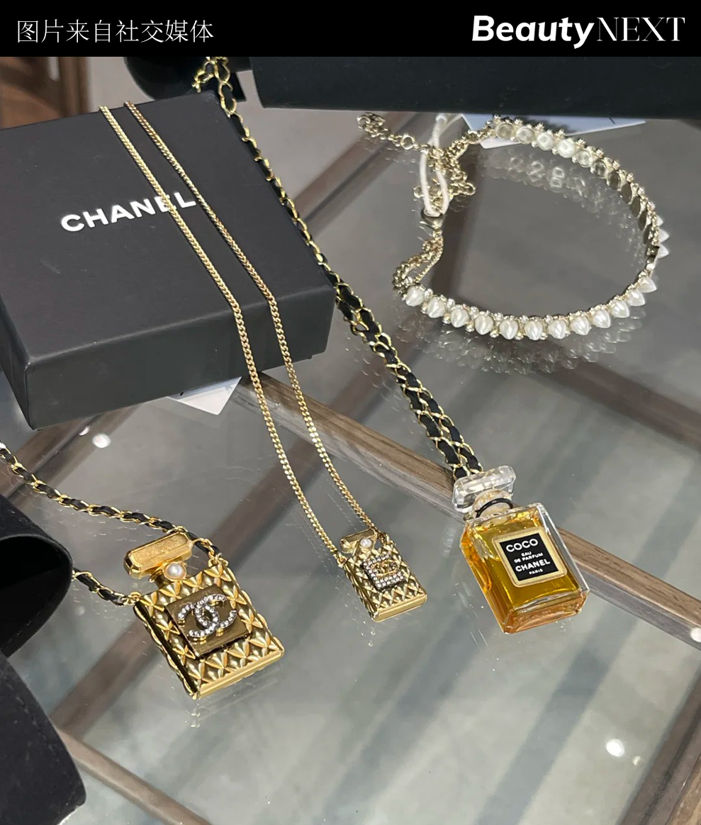 不止包掛,美妝配飾化的趨勢(shì)還蔓延到了首飾。首先是項(xiàng)鏈。“貝嫂”維多利亞·貝克漢姆設(shè)計(jì)了一款拉絲金瓶來(lái)裝香水,這款獨(dú)家香水瓶項(xiàng)鏈可輕松從配飾轉(zhuǎn)換為香水容器。
