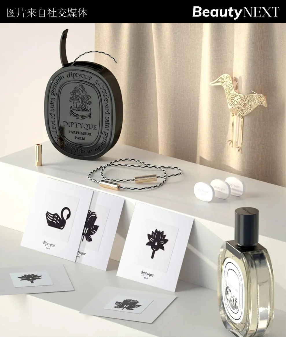 其次是手鏈和其他,Diptyque就曾推出Prêts-à-Parfumer系列,以配飾化的方式解構(gòu)了用香方式。該系列包含一款注入香氣的編織手鏈、一枚內(nèi)置香氛陶瓷片的鳥(niǎo)形胸針,以及三款可以直接貼在皮膚上的香氛貼紙。