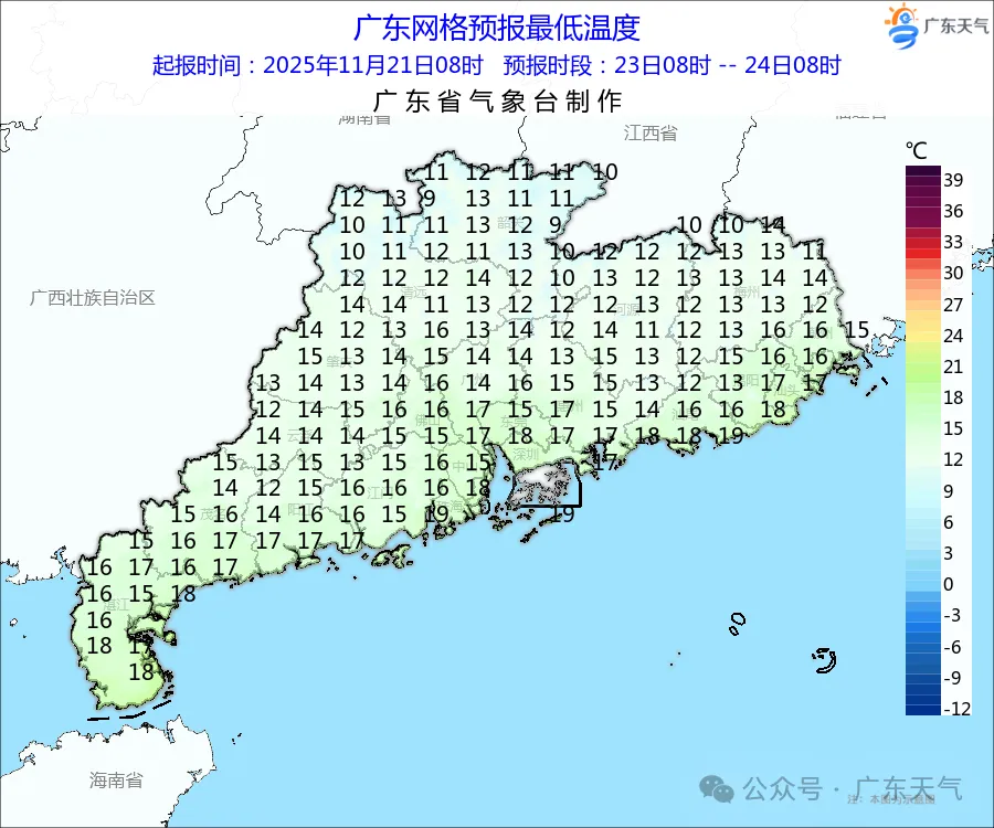 22日,中北部市縣晴到少云,南部市縣晴間多云。最低氣溫:粵北和珠江三角洲北部市縣6~9℃(高海拔山區(qū)2~5℃),南部沿海市縣13~16℃,其余市縣10~13℃。