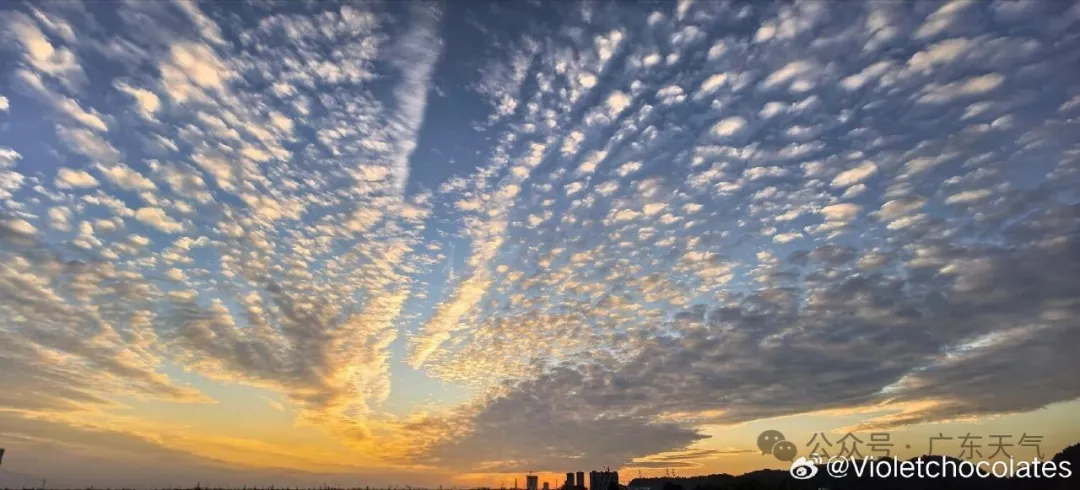 這兩天廣東上空頻繁出現(xiàn)的魚鱗云,學名為透光高積云,也是中層的濕區(qū)所產(chǎn)生的,高積云在早晨或傍晚容易出現(xiàn)霞光。