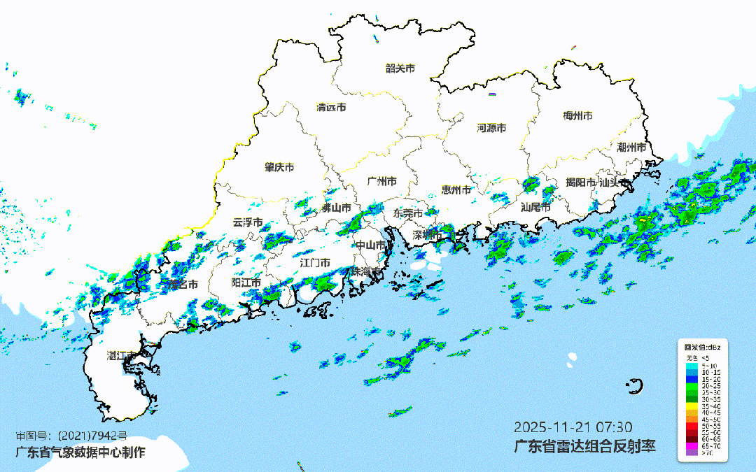 今天(11月21日)上午,從雷達圖可見,廣東的南部市縣有分散的降水回波自西向東移動,不過地面的氣象站幾乎沒有錄得雨量,究竟是怎么回事?