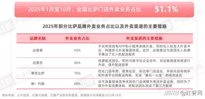 近年來(lái),外賣已成為比薩品類的主要銷售渠道之一,紅餐大數(shù)據(jù)顯示,2025年1月至10月,全國(guó)比薩門店外賣業(yè)務(wù)占比已達(dá)到51.1%,較2024年提升了1個(gè)百分點(diǎn)。眾多比薩品牌也愈發(fā)重視外賣業(yè)務(wù)的發(fā)展,例如,必勝客構(gòu)建了多元外賣渠道體系,其不僅依托自有APP和小程序承接外賣,同時(shí)也入駐各大外賣平臺(tái),根據(jù)其財(cái)報(bào),必勝客2025年第二季度外賣銷售額同比增長(zhǎng)15%,外賣業(yè)務(wù)占比達(dá)到43%,較2024年同期提升了5個(gè)百分點(diǎn);達(dá)美樂、尊寶比薩等品牌則主攻外賣業(yè)務(wù),其中達(dá)美樂在一線城市的外賣業(yè)務(wù)占比超過(guò)七成。