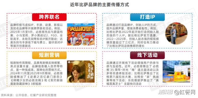 其中,跨界聯(lián)名已成為比薩品牌的常規(guī)營(yíng)銷舉措,諸如必勝客、達(dá)美樂、尊寶比薩、樂凱撒披薩、棒!約翰等品牌在2025年1月至9月期間與虛擬IP、手游、動(dòng)漫等開展了多次聯(lián)名活動(dòng)。同時(shí),伴隨著短劇營(yíng)銷在餐飲市場(chǎng)日漸火熱,部分比薩品牌迅速響應(yīng),如必勝客已推出了3部短劇,均取得了可觀的曝光效果。此外,在線下互動(dòng)方面,必勝客、比格比薩、樂凱撒披薩均通過(guò)多樣化的線下活動(dòng)與消費(fèi)者保持深度溝通與緊密聯(lián)系。