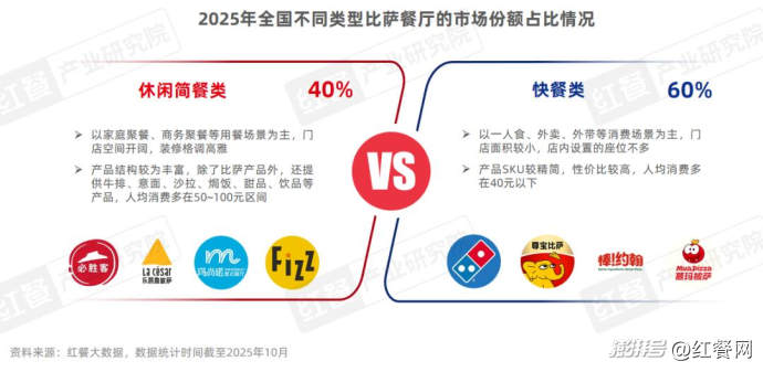 當(dāng)前,比薩市場(chǎng)呈現(xiàn)出“休閑簡(jiǎn)餐”與“快餐”雙陣營(yíng)并行的發(fā)展格局。其中,休閑簡(jiǎn)餐類的比薩餐廳以家庭聚餐、商務(wù)聚餐等用餐場(chǎng)景為主,產(chǎn)品結(jié)構(gòu)豐富,人均消費(fèi)大多在50~100元區(qū)間,此類比薩餐廳的市場(chǎng)份額占比約為40%,代表品牌有必勝客、樂凱撒披薩、比薩瑪尚諾等。
