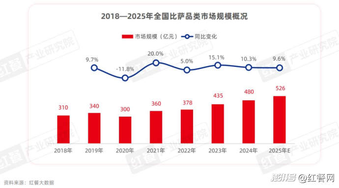 近年來(lái),在入局者持續(xù)涌入和消費(fèi)需求不斷增加的雙重驅(qū)動(dòng)下,比薩品類市場(chǎng)規(guī)模保持著穩(wěn)健增長(zhǎng)態(tài)勢(shì)。紅餐大數(shù)據(jù)顯示,2024年全國(guó)比薩品類市場(chǎng)規(guī)模達(dá)到480億元,同比增長(zhǎng)10.3%,預(yù)計(jì)2025年比薩品類市場(chǎng)規(guī)模將超過(guò)500億元。