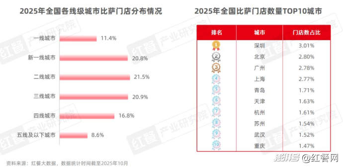 例如,必勝客2024年新增門店中超過(guò)六成是在三線及以下城市,截至2025年10月,必勝客在三線及以下城市的門店數(shù)占比已超過(guò)三成。達(dá)美樂2025年新入駐的城市以二線城市和三線城市為主,截至2025年10月,其一線城市的門店數(shù)占比已從2024年初的60%降至40%。此外,還有部分比薩品牌主攻下沉市場(chǎng),如披薩速遞、三只熊披薩、City1+1城市比薩等。