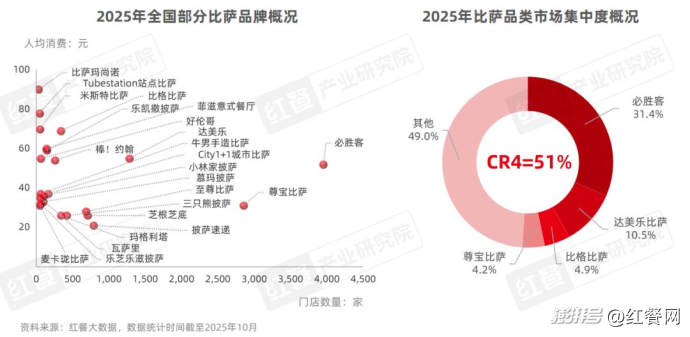 與此同時(shí),比薩品類的高連鎖化也推動(dòng)著比薩市場(chǎng)集中度的提升?;诟髌放频呢?cái)報(bào)數(shù)據(jù)以及公開信息披露,紅餐產(chǎn)業(yè)研究院測(cè)算,2025年必勝客、達(dá)美樂比薩、比格比薩和尊寶比薩四大品牌將有望合計(jì)占據(jù)51%的市場(chǎng)份額。
