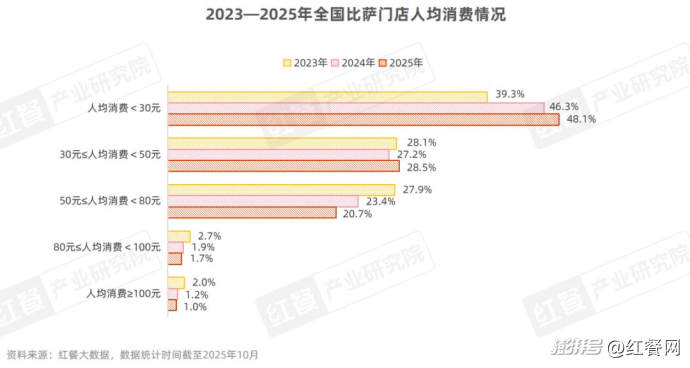 近年來(lái),隨著性價(jià)比消費(fèi)需求的持續(xù)攀升以及快餐類比薩門店的快速增長(zhǎng),比薩品類人均消費(fèi)呈下滑態(tài)勢(shì)。紅餐大數(shù)據(jù)顯示,截至2025年10月,人均消費(fèi)在30元以下的比薩門店占比達(dá)48.1%,居于首位;其次是30~50元區(qū)間,門店數(shù)占比為28.5%;人均消費(fèi)在50~80元區(qū)間的門店數(shù)占比也超過(guò)了20%;80元及以上的比薩門店占比則較少。