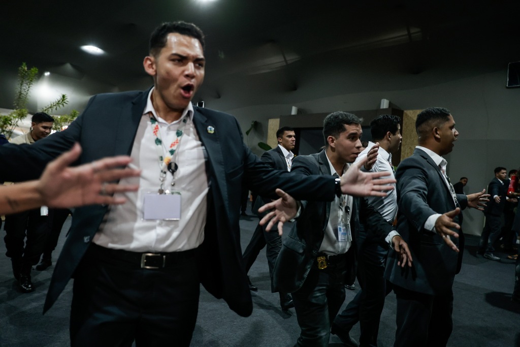 1月20日,巴西貝倫,消防員在聯(lián)合國氣候變化大會談判區(qū)撲滅火災(zāi)后,安保人員疏散現(xiàn)場。