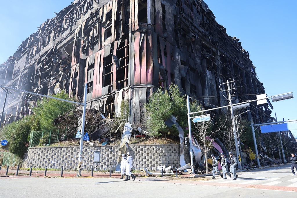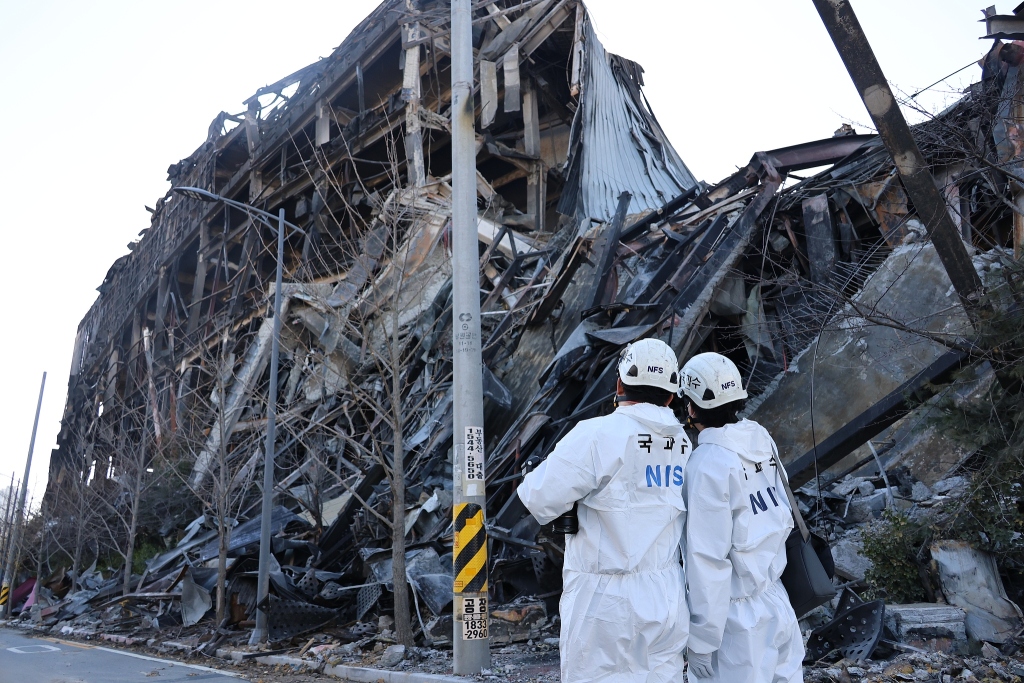 當?shù)貢r間2025年11月21日,韓國忠清南道天安市,消防、警察、國立科學搜查研究院等聯(lián)合調查組人員對時尚物流中心火災現(xiàn)場進行調查。視覺中國 圖