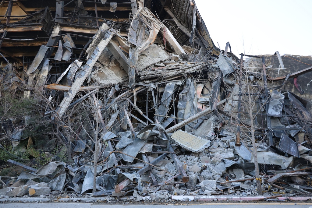 當?shù)貢r間2025年11月21日,韓國忠清南道天安市,衣戀集團(E-LAND)時尚物流中心發(fā)生火災后,建筑殘骸散落在人行道上。視覺中國 圖