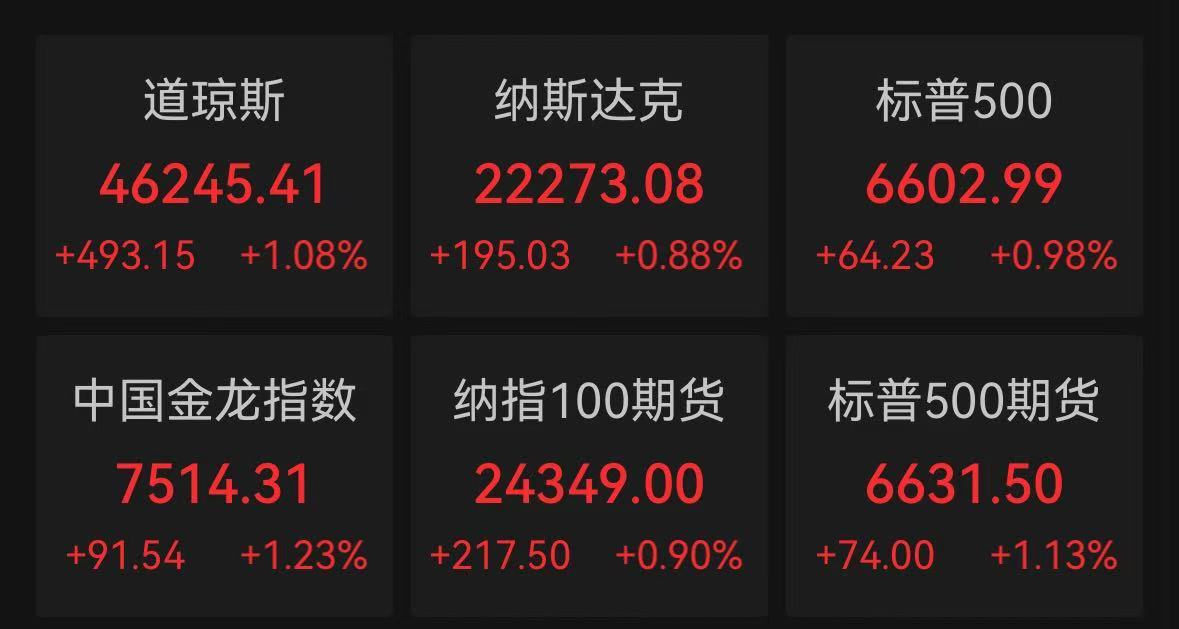 截至收盤,道指漲1.08%報46245.41點,標普500指數(shù)漲0.98%報6602.99點,納指漲0.88%報22273.08點。本周,道指跌1.91%,標普500指數(shù)跌1.95%,納指跌2.74%。