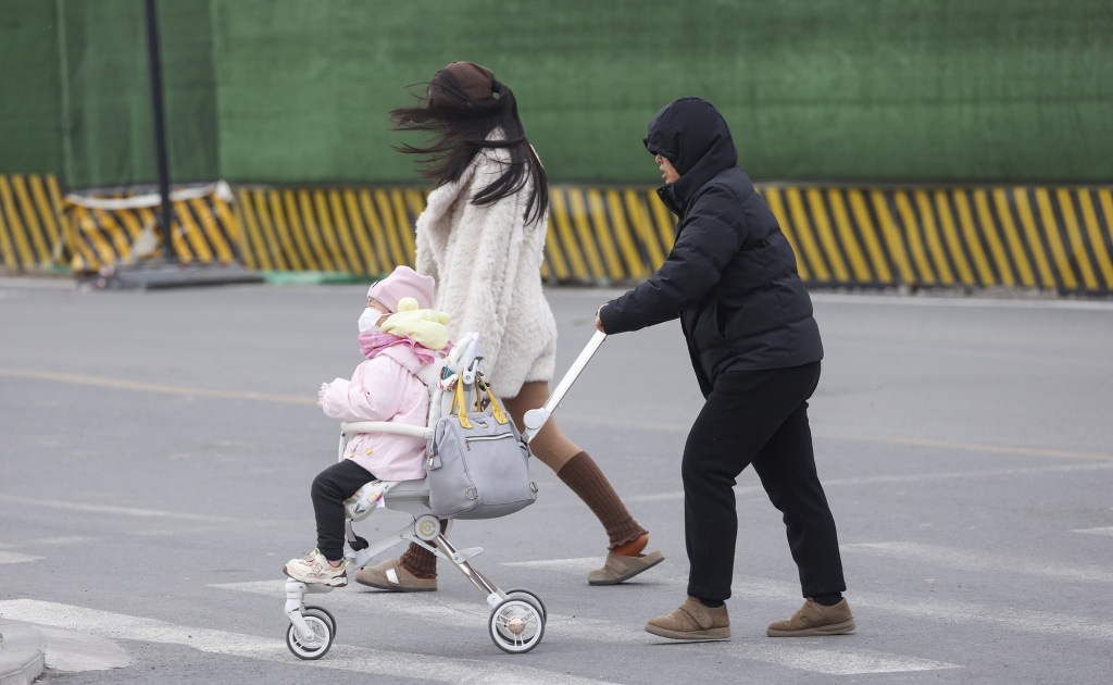 11月24日,家長(zhǎng)帶著孩子在風(fēng)中出行。當(dāng)日,北京迎來(lái)大風(fēng)降溫天氣。