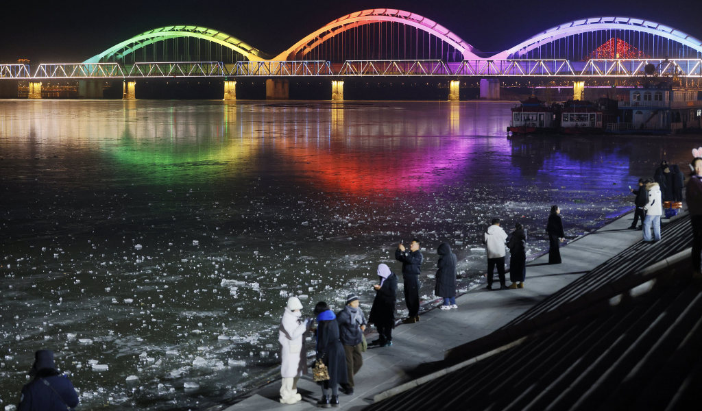 11月21日,黑龍江哈爾濱,冰城的嚴(yán)冬在松花江的冰封中悄然啟幕。夜幕降臨,游客們裹著厚厚的冬裝,在江畔打卡。