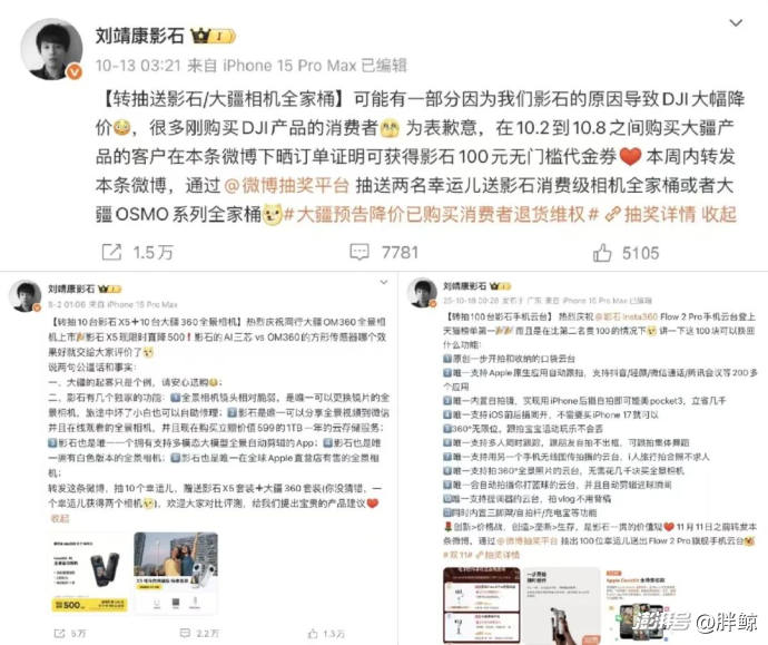 劉靖康多次針對(duì)大疆發(fā)文(圖片來自微博@劉靖康影石)