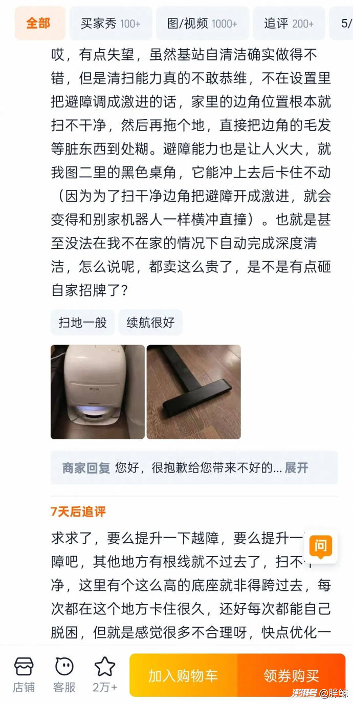 消費(fèi)者購(gòu)后反映,盡管避障功能優(yōu)秀,但掃地機(jī)應(yīng)有的基礎(chǔ)功能卻不及預(yù)期——清潔效果不理想、清潔耗時(shí)過長(zhǎng)、越障功能不佳。截止 11 月,該系列產(chǎn)品在淘寶和京東的官方旗艦店銷量分別為 9000 多臺(tái)與 2000 多臺(tái),不能稱得上“好”。