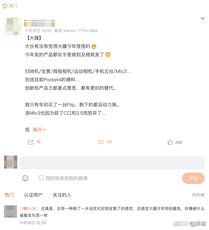 胖鯨認(rèn)為,這或許就是“大疆的詛咒”所在,當(dāng)某個(gè)品牌必須長(zhǎng)期定位于行業(yè)頂端,它不斷推出超越自身光環(huán)的產(chǎn)品。一旦有一條產(chǎn)品線未達(dá)到預(yù)期,消費(fèi)者就不會(huì)認(rèn)為是產(chǎn)品的問題,而是品牌“掉隊(duì)”了。