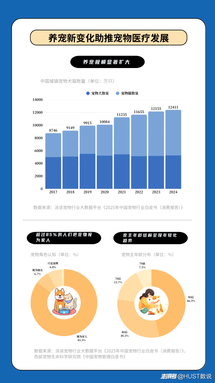 2017-2024年間,中國城鎮(zhèn)寵物犬貓飼養(yǎng)規(guī)模呈現(xiàn)顯著擴(kuò)張態(tài)勢,核心寵物貓狗總數(shù)從2017年的8746萬只躍升至2024年的12411萬只,以4.47%的復(fù)合增速持續(xù)增長。這一變化背后,蘊(yùn)含著社會結(jié)構(gòu)與養(yǎng)寵觀念的深層變遷。在快節(jié)奏的現(xiàn)代生活里,人們面臨著各種壓力,寵物主與寵物之間早已超越了簡單的飼養(yǎng)關(guān)系,寵物成為人們生活中重要的情感陪伴。同時,隨著寵物主年齡結(jié)構(gòu)呈現(xiàn)出的年輕化趨勢,越來越多鏟屎官注重科學(xué)養(yǎng)寵,重視寵物的健康問題,愿意為寵物提供更好的醫(yī)療服務(wù),寵物醫(yī)療行業(yè)的市場規(guī)模不斷擴(kuò)大,逐漸覆蓋全生命周期的健康服務(wù)。