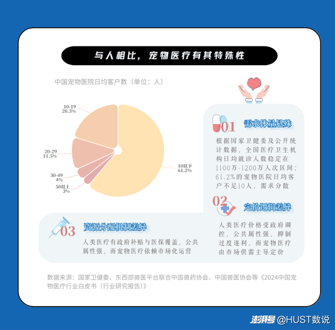 相較于人類醫(yī)院,寵物醫(yī)院有其特殊性,面臨市場需求有限、客流量低的現(xiàn)實(shí)困境。據(jù)《2024中國寵物醫(yī)療行業(yè)白皮書》顯示,超八成寵物醫(yī)院日均客戶數(shù)只有20以內(nèi),不足人類醫(yī)院的零頭。因此寵物醫(yī)院難以像人類醫(yī)院那樣實(shí)現(xiàn)大規(guī)模運(yùn)營以攤薄各項(xiàng)成本;諸如設(shè)備采購、藥品儲備、場地租賃、人員薪酬這些成本都只能由有限的客戶群體來分擔(dān)。在此情況下,為了維持正常運(yùn)轉(zhuǎn),寵物醫(yī)院不得不提高單次診療服務(wù)的價格,這就直接導(dǎo)致了寵物看病費(fèi)用高昂的現(xiàn)狀。
