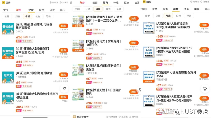 此外,相似醫(yī)療項(xiàng)目方面,寵物醫(yī)療的費(fèi)用價格是“人醫(yī)”三甲醫(yī)院醫(yī)療費(fèi)用的2~10倍。某市聯(lián)合動物醫(yī)院價目表顯示,骨科X光收費(fèi)270元,而人類同類檢查僅需80元;心臟彩超單次收費(fèi)高達(dá)500多元,是人體檢查費(fèi)用的2倍以上。此外,寵物絕育價格亂象凸顯行業(yè)定價標(biāo)準(zhǔn)模糊的問題。部分寵物醫(yī)院母貓絕育套餐價格跨度達(dá)1700元,其中“經(jīng)濟(jì)款”折后需226到480元不等,而“超聲刀微創(chuàng)絕育”折后收費(fèi)為530元到1977元,同一體重區(qū)間內(nèi)折后差價超千元。