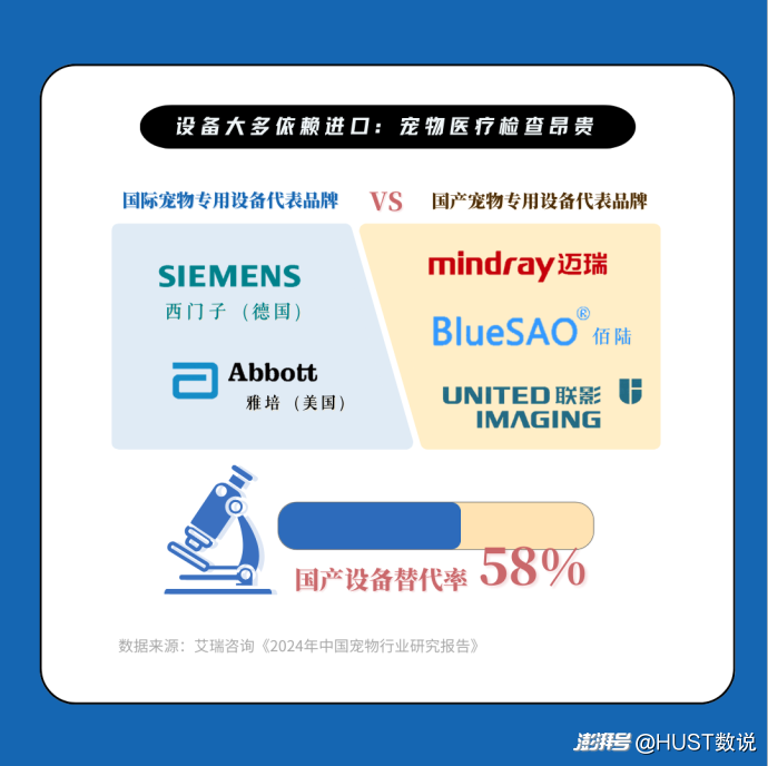 寵物醫(yī)療與人類醫(yī)療不同,動物無法像人一樣準(zhǔn)確表達(dá)自己的不適,醫(yī)生只能通過開具一系列檢查來確定具體病因。在寵物醫(yī)療產(chǎn)業(yè)初期,寵物專用設(shè)備幾乎被國際廠商所壟斷,此類跨國企業(yè)憑借其技術(shù)積累和創(chuàng)新,在國內(nèi)產(chǎn)業(yè)鏈中具有較大話語權(quán)。直到近幾年,一些人醫(yī)設(shè)備企業(yè)開始布局寵物醫(yī)療領(lǐng)域,國內(nèi)寵物設(shè)備才開始逐漸趕超國外企業(yè),但目前國產(chǎn)寵物設(shè)備替代率僅有58%,部分精密手術(shù)所需的耗材,如胸腔穿刺引流類產(chǎn)品,進(jìn)口品牌仍處于主導(dǎo)地位。