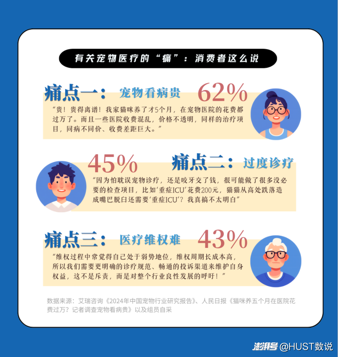 “收費(fèi)貴”“誘導(dǎo)消費(fèi)”“治療不達(dá)預(yù)期”“過度診療”等詞匯頻繁出現(xiàn),成為消費(fèi)者投訴的重災(zāi)區(qū)。這些問題不僅損害了消費(fèi)者的經(jīng)濟(jì)利益,還可能對寵物的健康造成嚴(yán)重威脅。其中,“寵物看病貴”以62%的占比高居榜首,成為消費(fèi)者最為詬病的問題。高昂的醫(yī)療費(fèi)用讓許多寵物主人望而卻步,甚至不得不放棄對寵物的治療。而“過度診療”和“醫(yī)療維權(quán)難”以45%和43%的占比緊隨其后,這些問題使消費(fèi)者在面對寵物醫(yī)療糾紛時陷入困境,難以有效維護(hù)自身和寵物的合法權(quán)益。