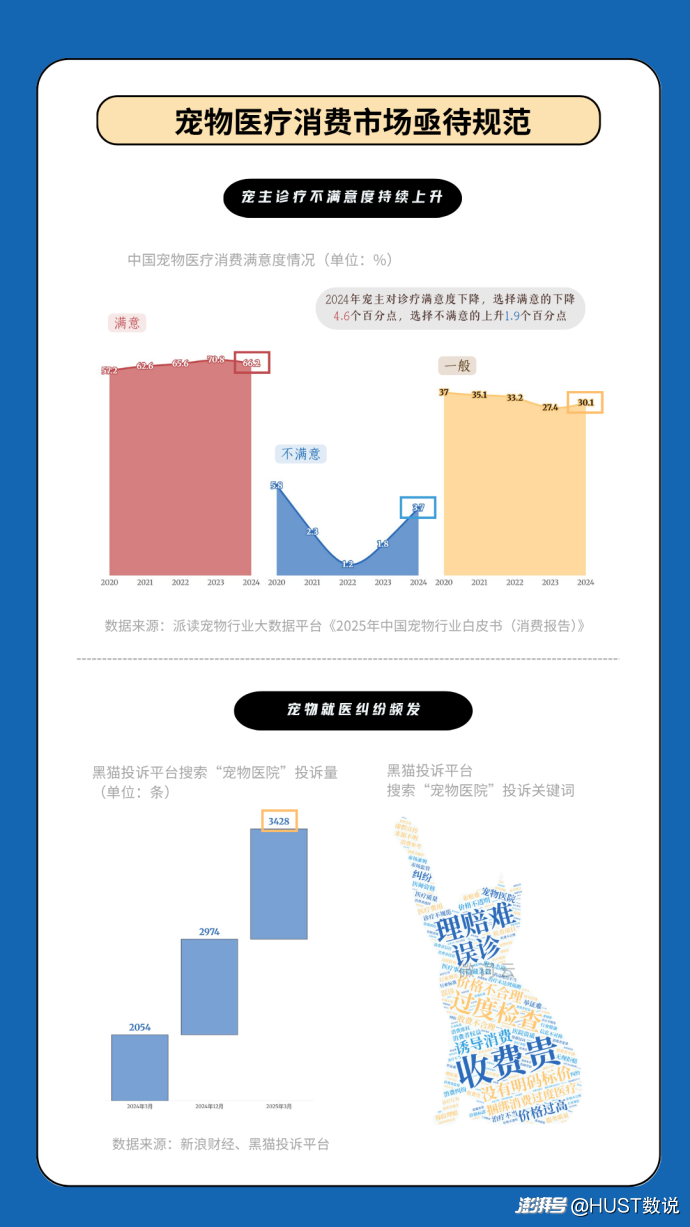 據(jù)《2025年中國寵物行業(yè)白皮書(消費(fèi)報告)》顯示,寵物主對寵物診療的不滿意度持續(xù)上升,導(dǎo)致與寵物就醫(yī)相關(guān)的糾紛頻發(fā)。自2024年2月至2025年3月,僅僅一年多時間黑貓投訴平臺上針對寵物醫(yī)院的投訴量呈現(xiàn)迅猛增長態(tài)勢。從2024年2月的2054起,到2024年12月的2974起,再到2025年3月的3428起……這一連串不斷攀升的數(shù)字,不僅直觀反映出寵物醫(yī)療行業(yè)問題正日益凸顯,更折射出消費(fèi)者對寵物醫(yī)療行業(yè)規(guī)范的期待。
