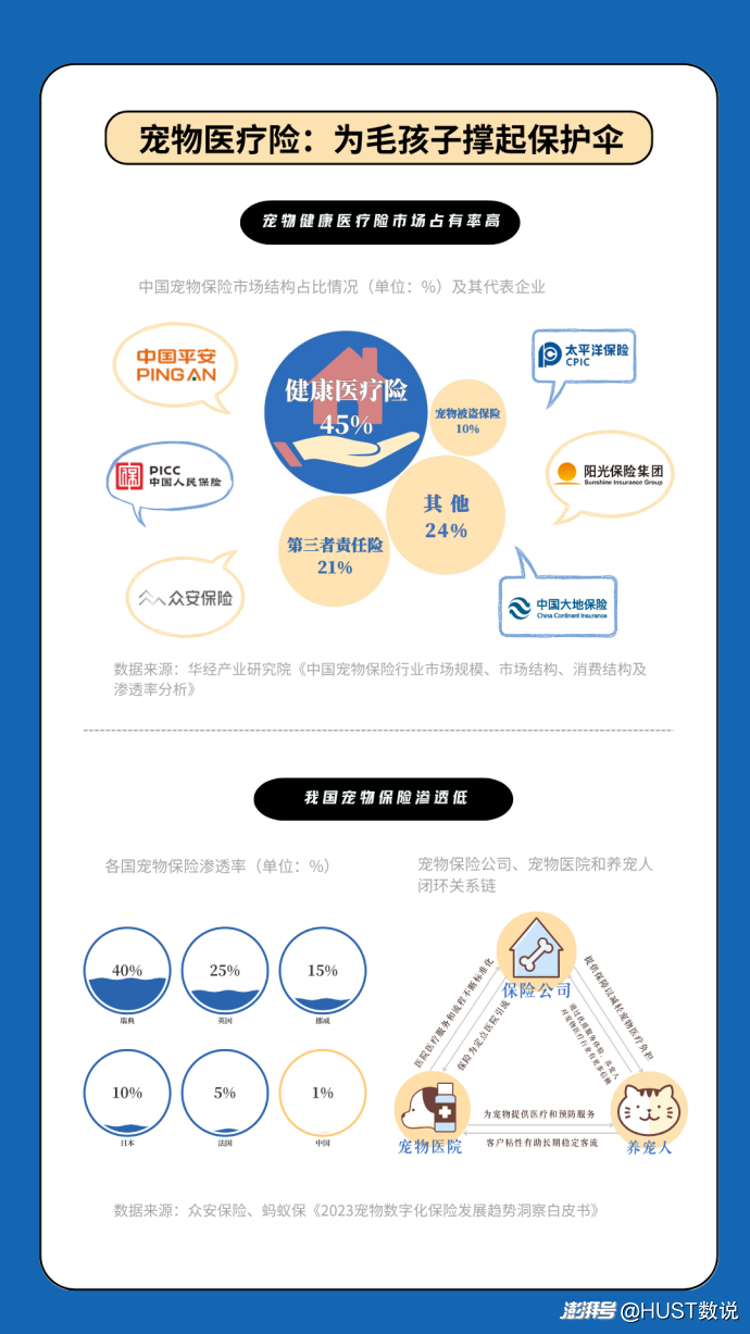 目前我國寵物保險險種主要分為健康醫(yī)療險、第三者責(zé)任險、寵物被盜保險、其他等幾類。但從滲透率來看,中國的寵物保險滲透率與頭部國家相比,具有相當(dāng)大的成長空間。