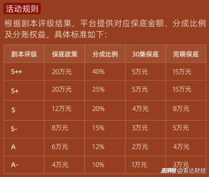 具體而言,新政策調(diào)整了保底和分成比例,最高保底20萬元,最高分成比例則提升至40%。而紅果的這一舉措,其目的是想打破以往相對(duì)平均化的分配模式,讓優(yōu)秀的創(chuàng)作者得到更豐厚的收益。
