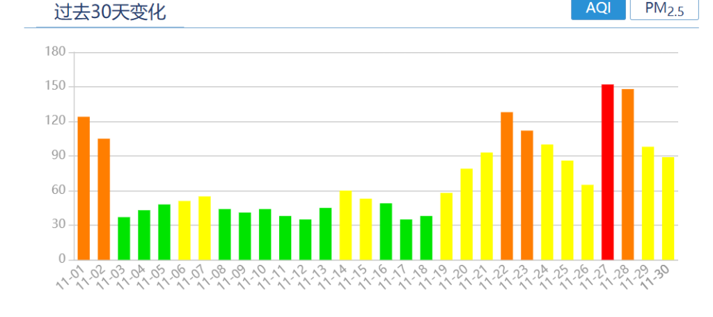 2025年11月AQI(空氣質(zhì)量指數(shù))變化。 上海市生態(tài)環(huán)境局官網(wǎng) 圖