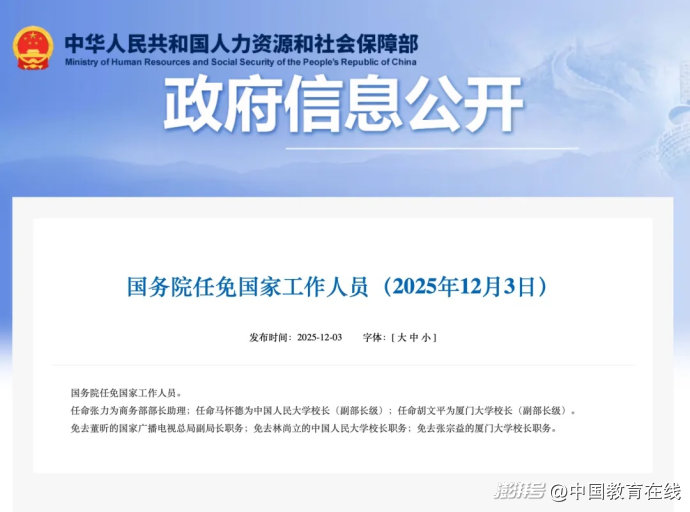 據人社部網站12月3日消息,國務院任免國家工作人員。