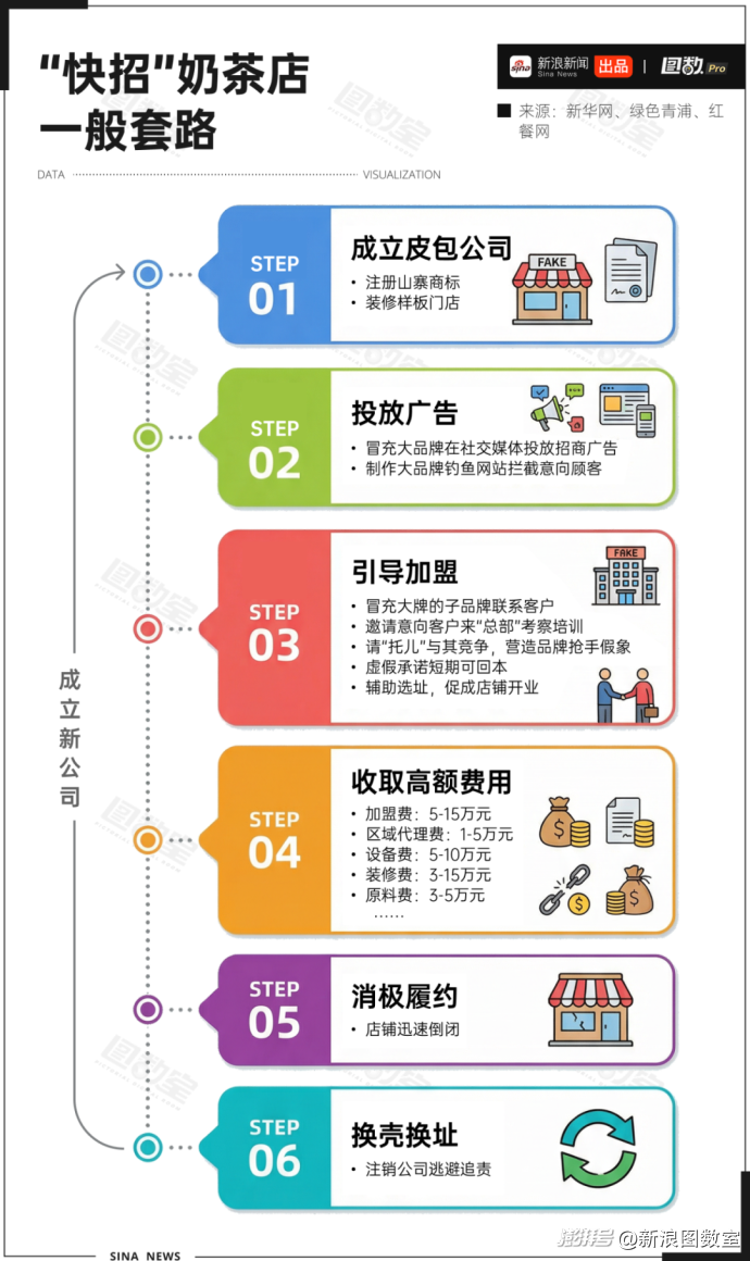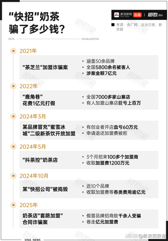 據(jù)報(bào)道,2021年,一起涉及50多個(gè)奶茶品牌的“快招”加盟詐騙案被警方偵破,全國(guó)超5800人受害,涉案金額高達(dá)7億元。該品牌代言明星隨后公開(kāi)道歉并解約。