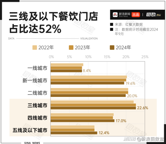 一個(gè)直接的表現(xiàn)是,三線及以下城市的餐飲市場(chǎng)已經(jīng)非常擁擠了。紅餐大數(shù)據(jù)顯示,三線以下城市餐飲門店數(shù)量顯著高于上年,這與一二線城市餐飲門店發(fā)展趨勢(shì)截然相反。截至2024年9月,全國(guó)三線及以下城市的餐飲門店數(shù)占比已達(dá)到52%。