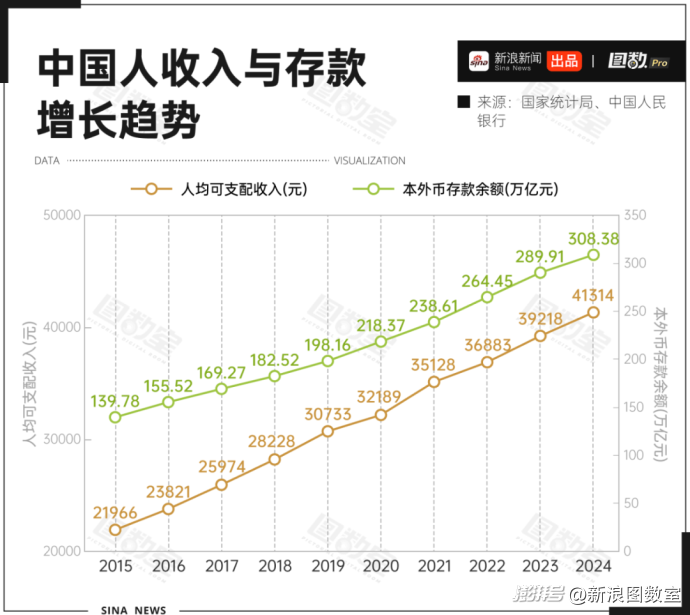 因?yàn)樗麄兛赡苁钱?dāng)下最有錢有閑還有焦慮的一群人。從2015年到2024年,全國(guó)人均可支配收入從近2.2萬(wàn)元漲到了4.1萬(wàn)元,幾乎翻倍。而全中國(guó)人的存款更是驚人,從不到140萬(wàn)億元飆升到308萬(wàn)億元。