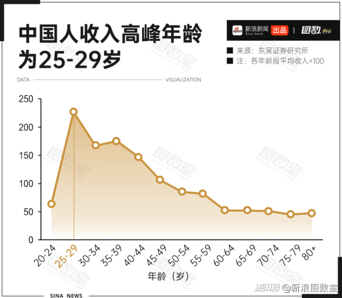 數(shù)據(jù)顯示,2022年,我國(guó)收入高峰年齡為25-29歲,以30歲為節(jié)點(diǎn),收入開(kāi)始大幅下滑。40之后更是像坐滑梯,一路下跌。