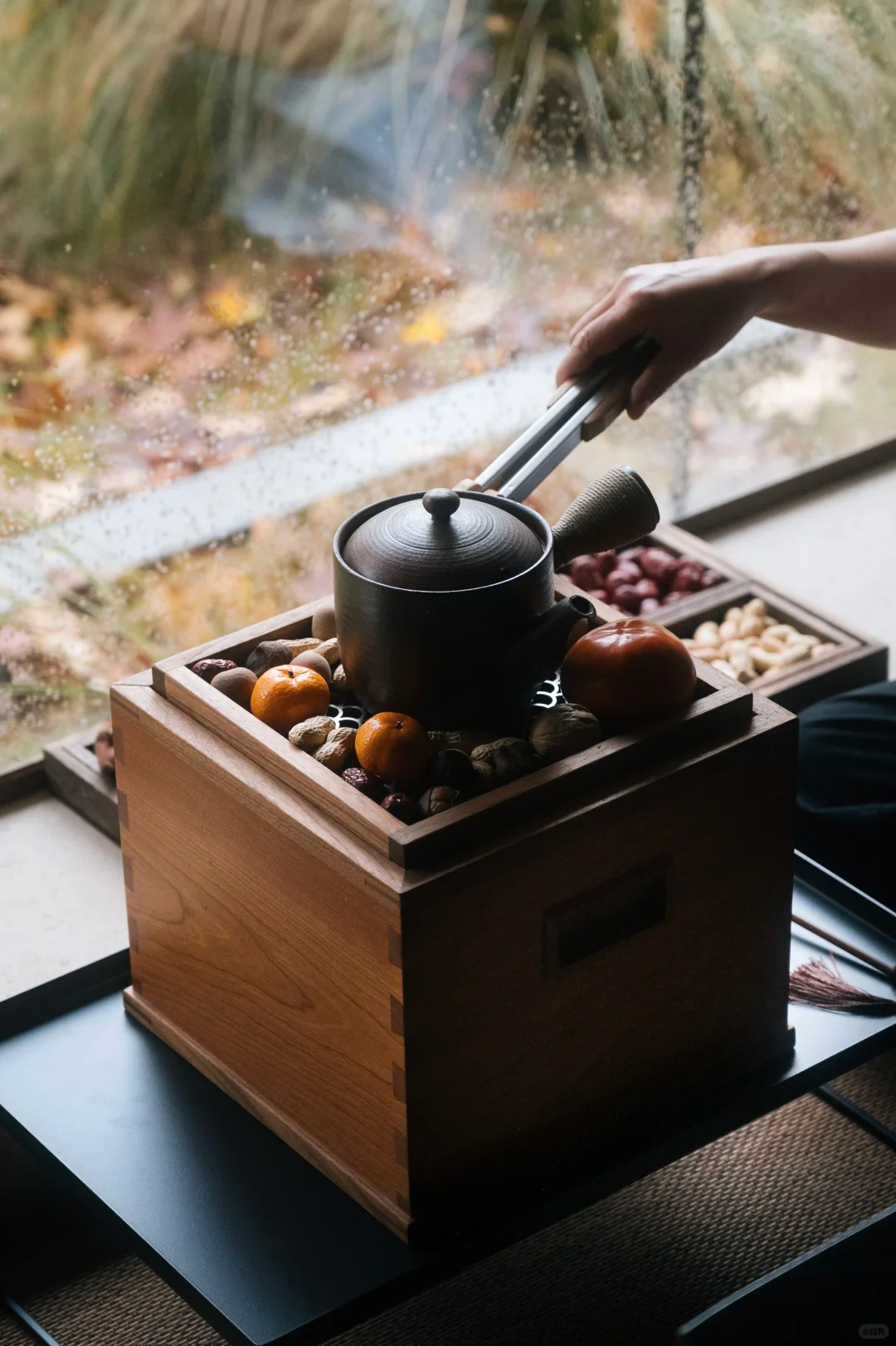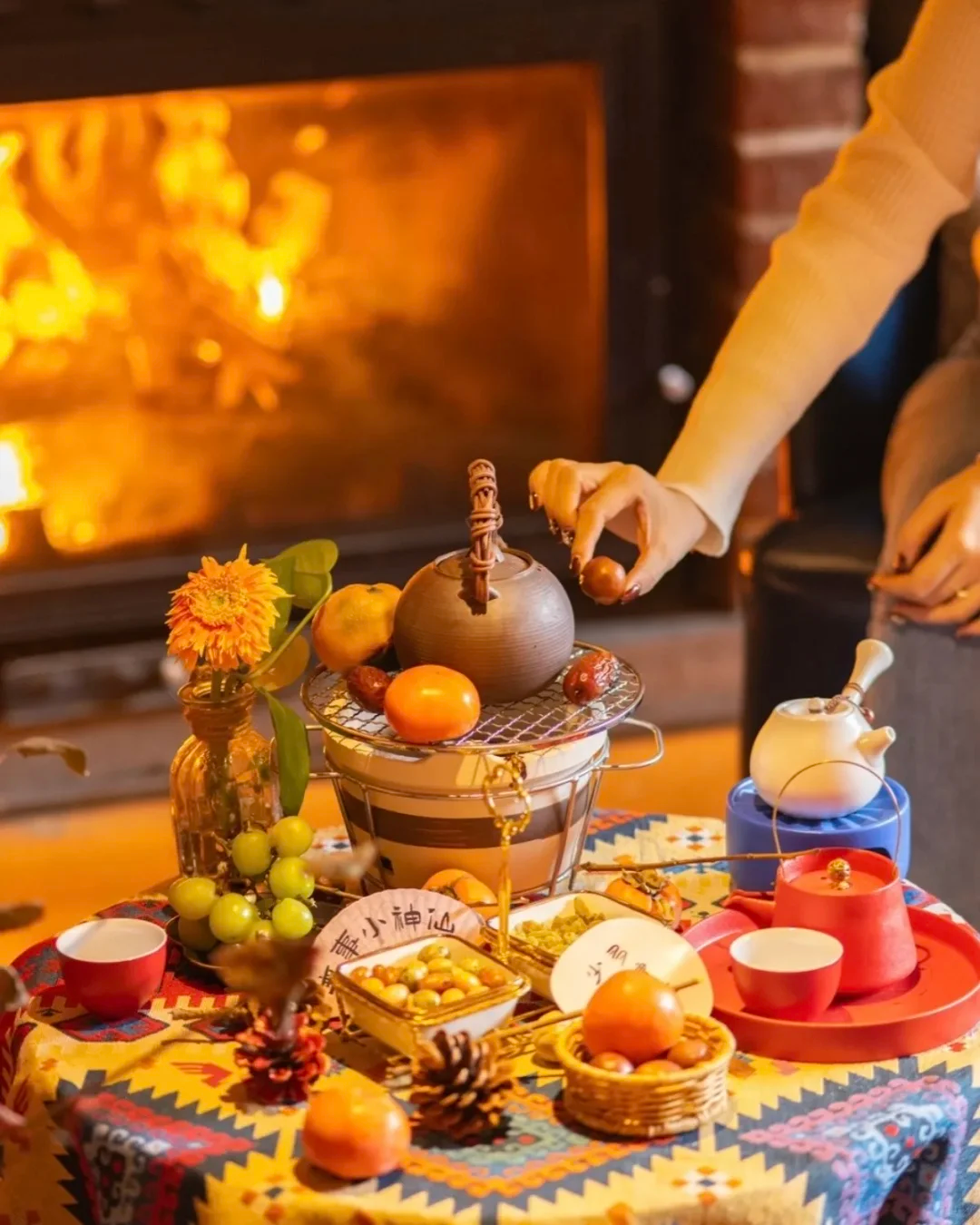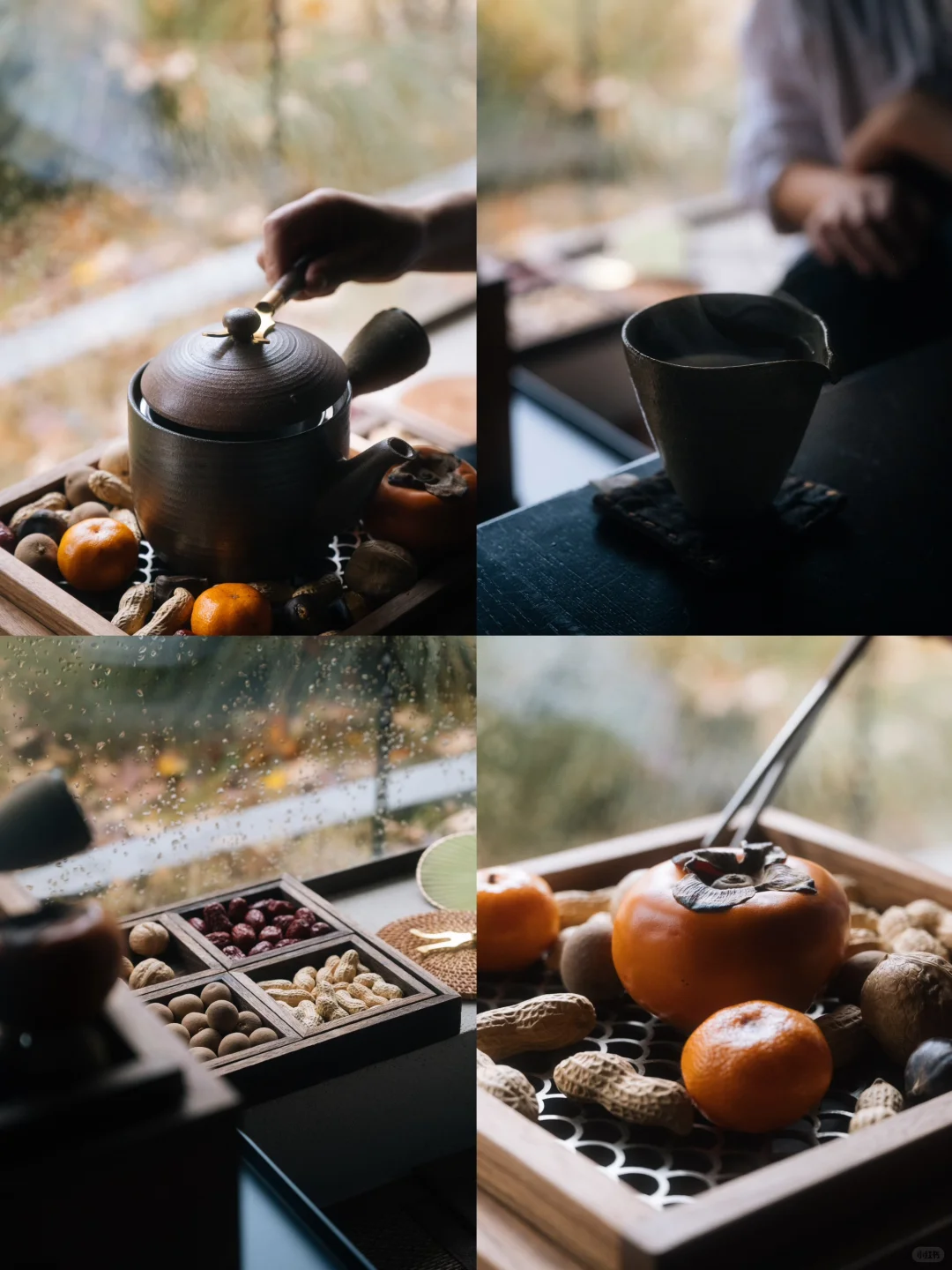 而真正的冬日儀式,在窗邊悄然展開——圍爐煮茶,正是此時最應(yīng)景的享受。爐上茶香裊裊,盤中干果茶點(diǎn)豐足,周圍圍繞的全是暖意、茶香與相聚的歡愉。