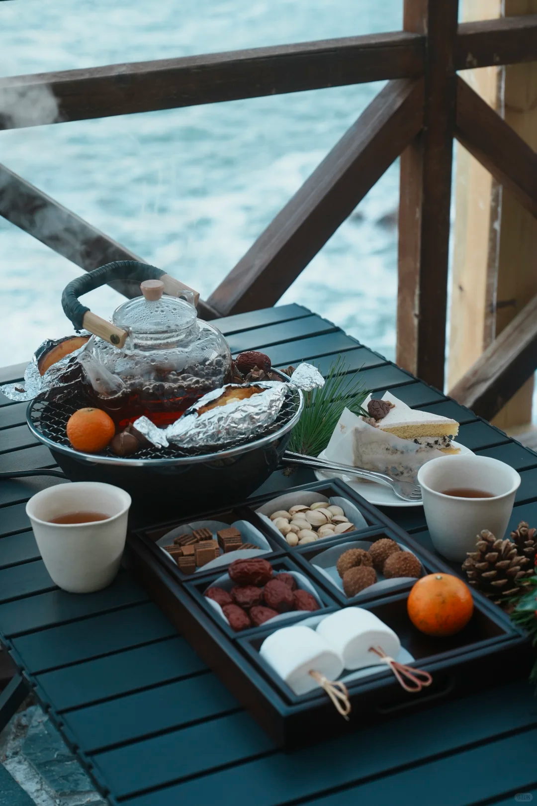 你可以選一個面向大海的位置,看潮水在黑色礁石上撞成雪白的浪。陽光穿過整面落地窗,海面碎成千萬片粼粼的金;圍爐上的茶壺開始冒出細(xì)密的白氣,爐火噼啪,和遠(yuǎn)處的海浪聲一唱一和。