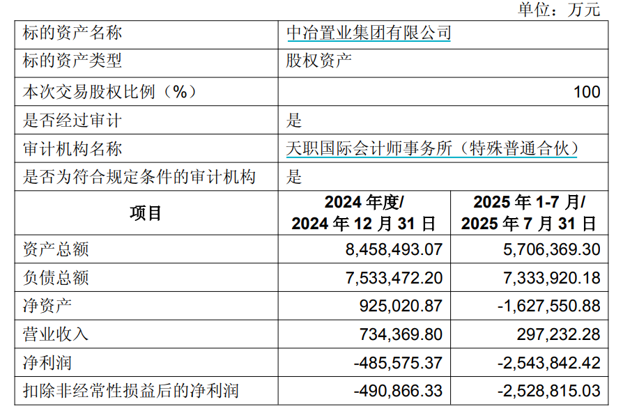 公告顯示,中冶置業(yè)作為房地產(chǎn)公司,經(jīng)營面臨壓力,已經(jīng)資不抵債。截至2025年7月31日,中冶置業(yè)總資產(chǎn)570.64億元,負(fù)債總額733.39億元,凈資產(chǎn)為-162.76億元;1-7月營業(yè)收入29.72億元,凈虧損254.38億元。