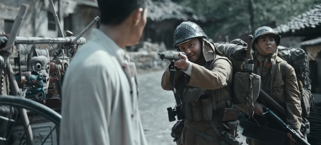 比如尹正飾演的日本兵,進(jìn)村時候極度囂張也極端殘忍,因?yàn)樗逦刂乐恍?0分鐘就可以屠掉這個僅50口人的小鎮(zhèn),也知道彼時中國普通老百姓面對武力如何膽怯和懦弱。但當(dāng)同伴在他面前被炮彈擊殺,他的虛張聲勢被殘破的尸體戳破,精神潰敗,遇到太爺這樣的白發(fā)老人都只想避而遠(yuǎn)之。