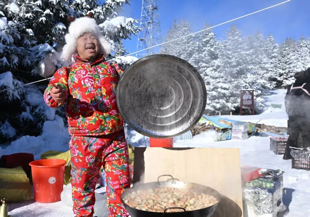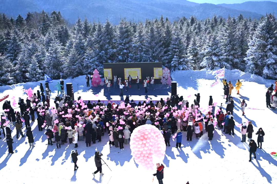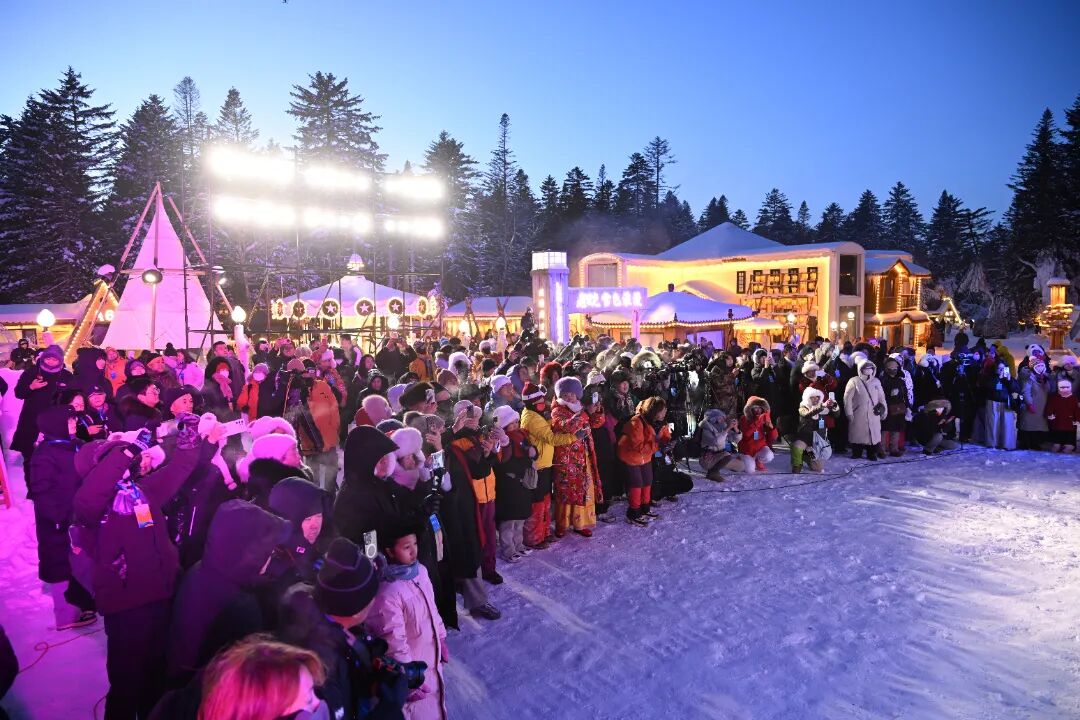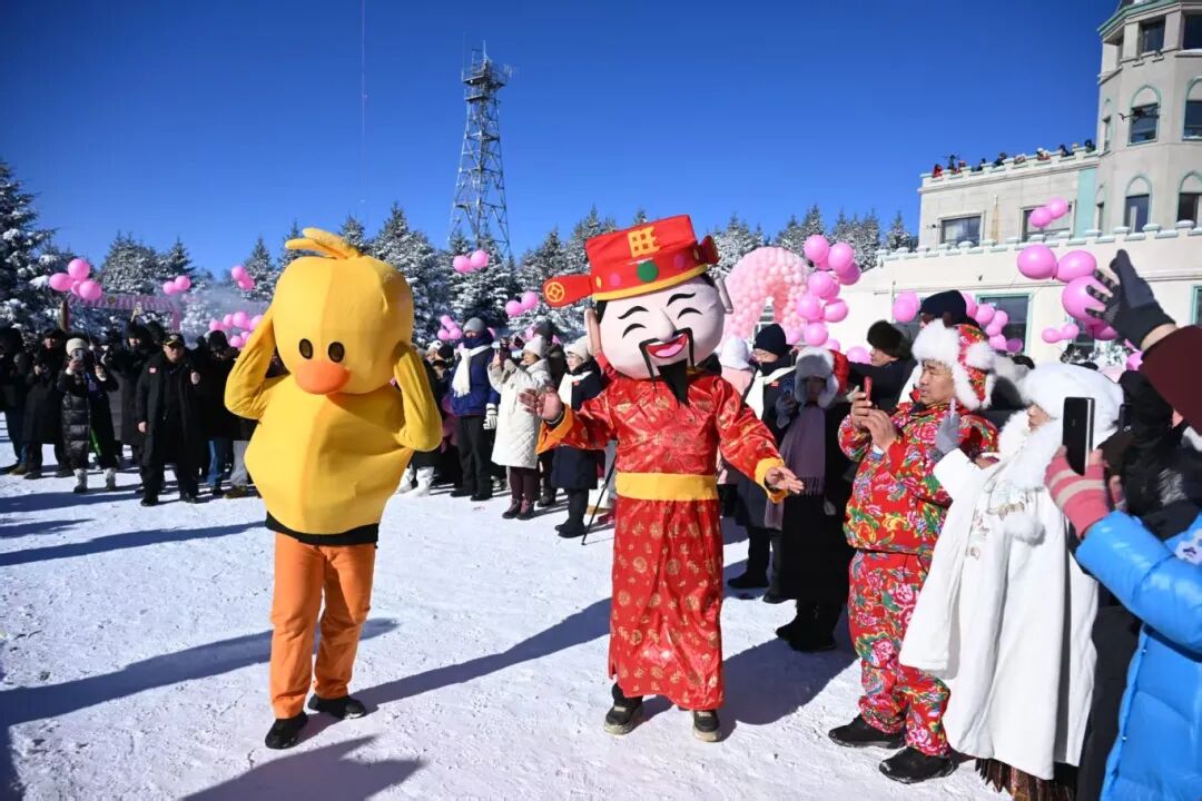 在雪嶺,啟動儀式在歌伴舞《大東北我的家鄉(xiāng)》節(jié)目中拉開序幕,現(xiàn)場氛圍熱烈,銀裝素裹的雪嶺景區(qū)與特色活動相映成趣。