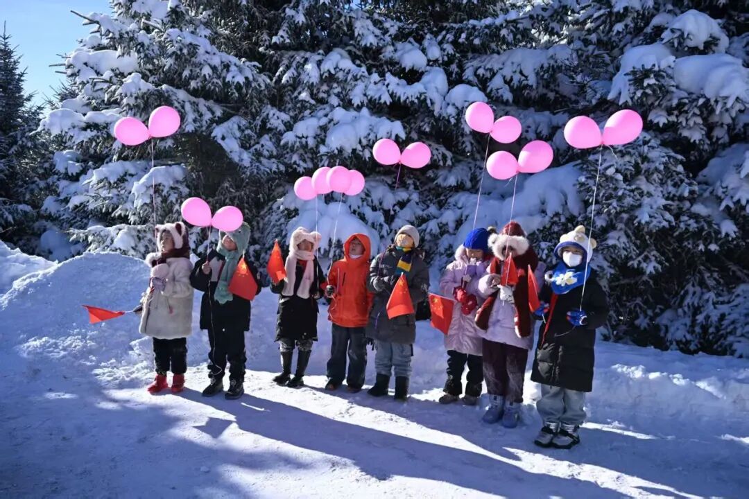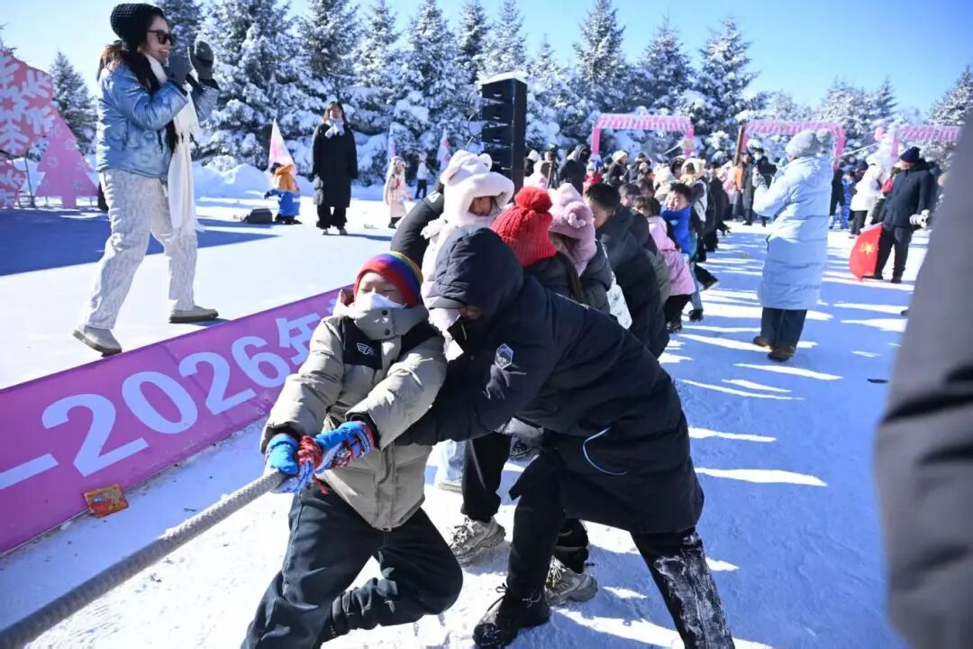 啟動儀式后,現(xiàn)場嘉賓及游客深入雪嶺景區(qū),沉浸式體驗民族歌舞快閃、吉他彈唱等互動演出,觀看剪紙、鐵藝、糖人等非遺技藝,參與雪地拔河、趣味套圈等冰雪游戲,品嘗參雞湯、關(guān)東煮等特色美食。在粉色雪景網(wǎng)紅拍照點、溫馴麋鹿互動區(qū),嘉賓與游客興致盎然,紛紛駐足與麋鹿親密互動、合影留念,定格浪漫愜意瞬間。參加研學(xué)活動的孩子們在老師的組織下拔河、做游戲,讓雪嶺的冰天雪地變成歡樂的海洋。