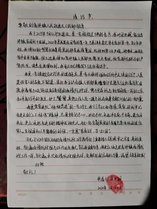 2020年1月25日,得知疫情消息的田世明立即向高坪鎮(zhèn)人武部遞交了“請戰(zhàn)書”,請求奔赴一線抗疫。