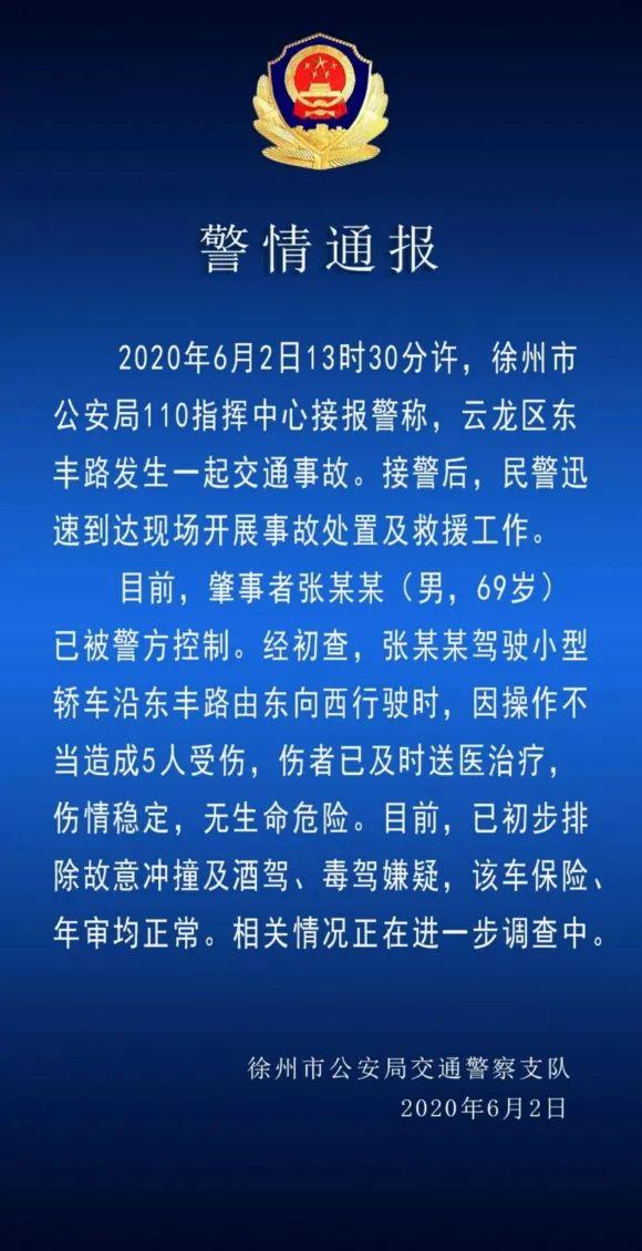 徐州警方通報稱,肇事司機張某某已被警方控制,初步排除故意沖撞及酒駕、毒駕嫌疑,相關(guān)情況正在進一步調(diào)查中。