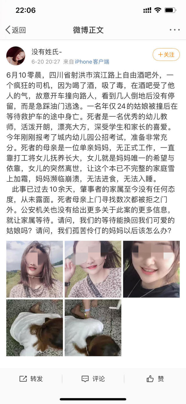 十天后,20日晚,死者家屬網(wǎng)上發(fā)帖,稱肇事者當(dāng)晚吸毒、飲酒駕車,故意沖撞行人后逃逸。公安機(jī)關(guān)未給出明確答復(fù),肇事者家屬也從未露面。