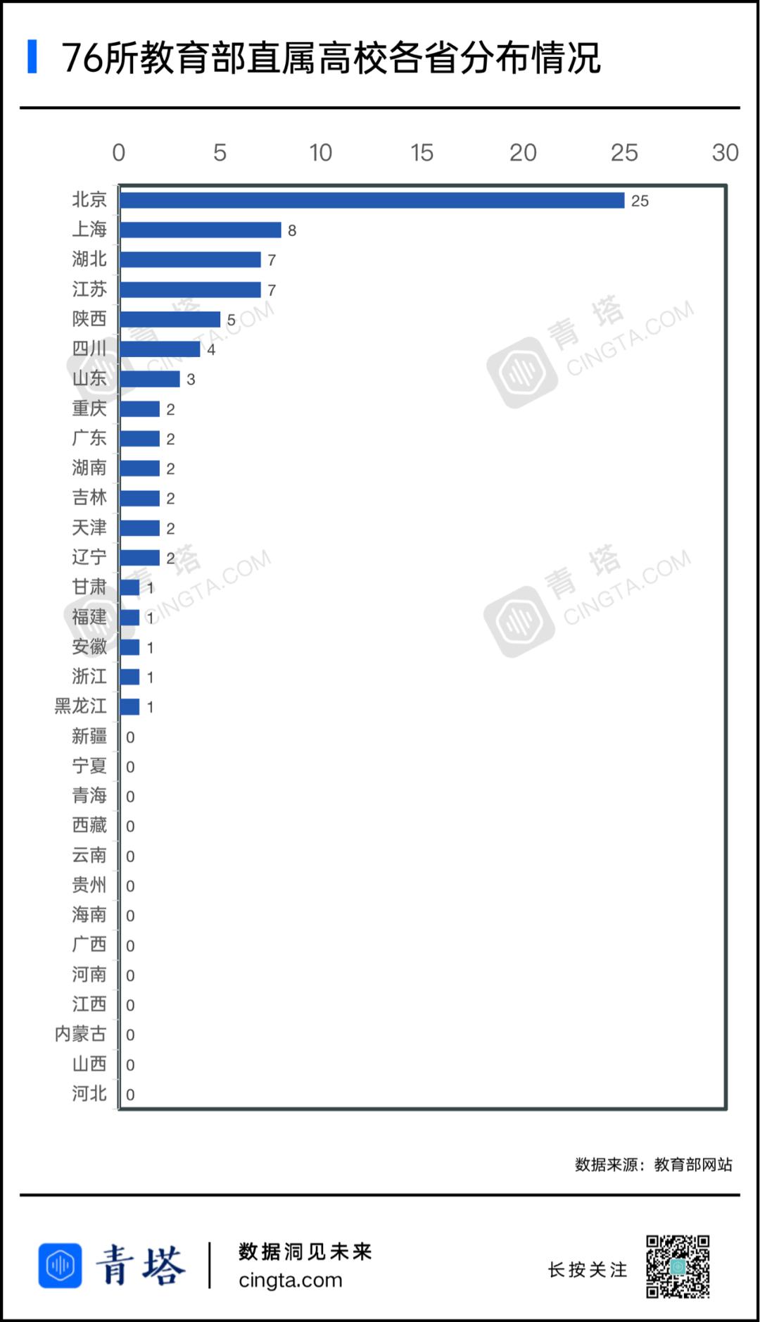目前,我國共有普通高等院校2740所,但中央部屬高校卻不多。以教育部直屬高校為例,全國共有76所教育部直屬高校,按照教育公平分配原則,教育部直屬高校理應(yīng)分布至全國所有省份,每?。▍^(qū))最少分配兩所,但現(xiàn)實是,僅北京和上海就擁有33所教育部直屬高校,占據(jù)半壁江山。