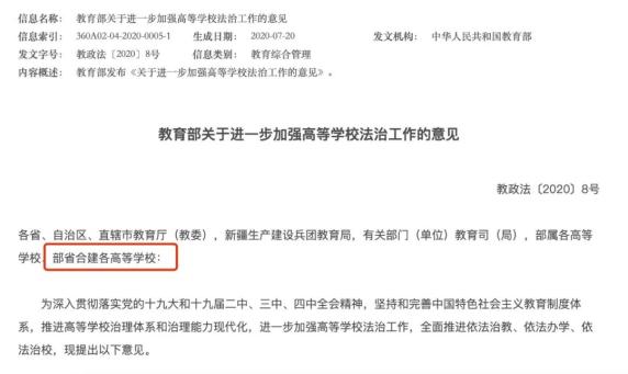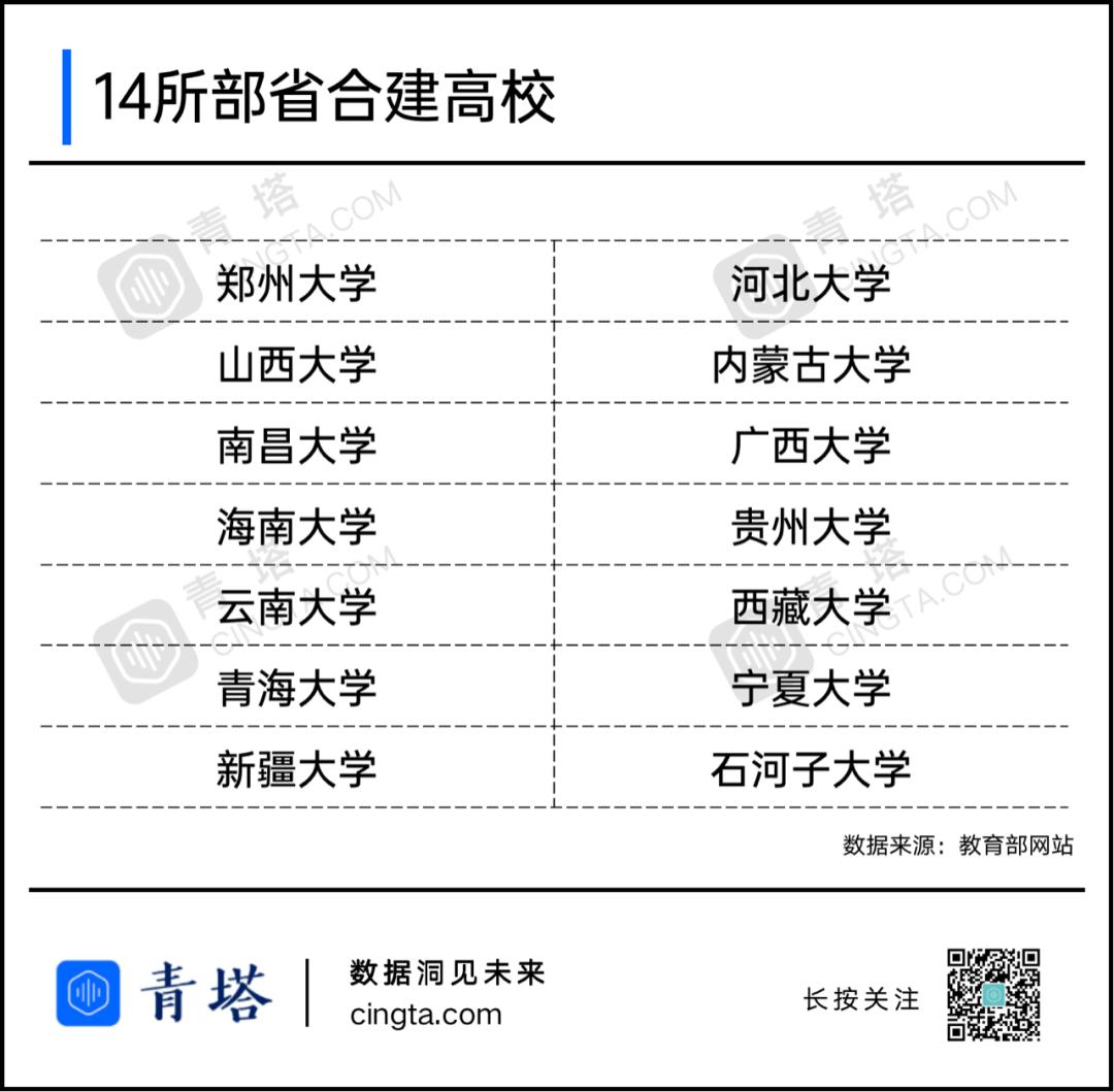 為促進(jìn)區(qū)域高等教育均衡發(fā)展,平衡高等教育弱省的利益,2018年2月,國家在尚無中央高校的13個省區(qū)和新疆生產(chǎn)建設(shè)兵團,按“一省一?!痹瓌t,重點支持鄭州大學(xué)、河北大學(xué)、山西大學(xué)、南昌大學(xué)等14所高校建設(shè),將這些納入教育部管理,稱為“部省合建”高校。
