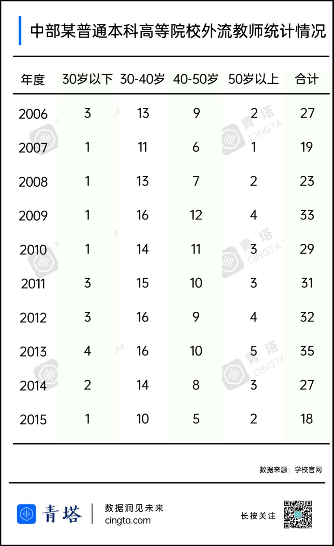 必須注意的是,雖然50歲以上的教師流失率較低,但這個年齡段的教師以教授為主,且多為學(xué)科帶頭人或課題的專業(yè)負(fù)責(zé)人,這類高水平人才的流失對學(xué)校的建設(shè)發(fā)展的打擊是致命的,甚至可能影響到一個學(xué)科的持續(xù)生存與良性發(fā)展。