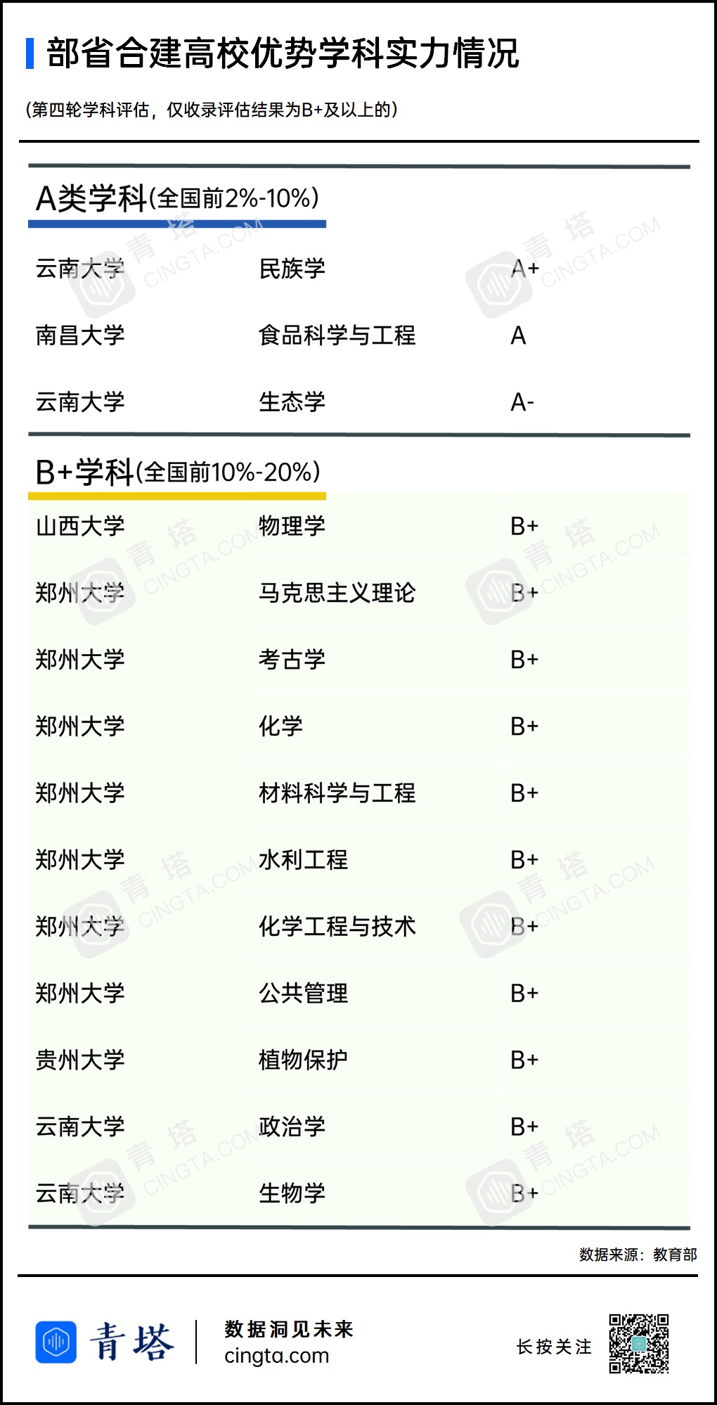 在教育部第四輪學(xué)科評估中,云南大學(xué)的民族學(xué)獲評A+,位列全國前2名或前2%,生態(tài)學(xué)獲評A-;南昌大學(xué)的食品科學(xué)與工程獲評A,鄭州大學(xué)共有7個學(xué)科入選B+,表現(xiàn)尚佳。