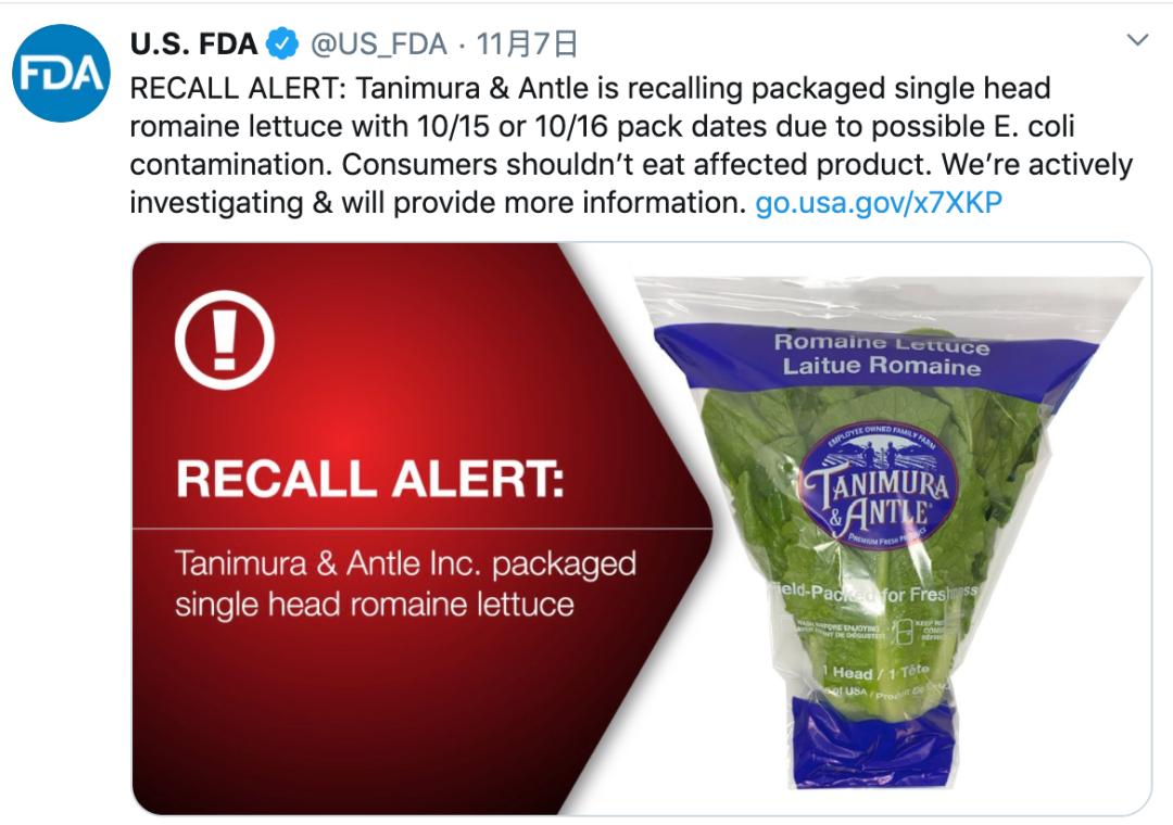 近期美國(guó)FDA官網(wǎng)發(fā)布公告稱,Tanimura&Antle 公司正主動(dòng)召回已經(jīng)分發(fā)波多黎各及全國(guó)19個(gè)州近4000箱精選單頭長(zhǎng)葉萵苣生菜(Romaine lettuce),以防止可能的大腸桿菌O157:H7(E. coli O157:H7)污染。受影響的生菜帶有“包裝日期為10/15/2020或10/16/2020”的標(biāo)簽。生菜上的UPC編號(hào)是0-27918-20314-9。FDA稱目前還沒(méi)有其他產(chǎn)品或包裝日期需要召回。據(jù)悉,受到污染生菜至少運(yùn)到了1000多家沃爾瑪商店。