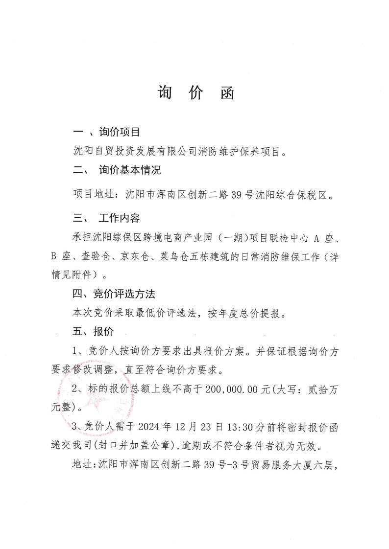 附件3: 沈陽(yáng)自貿(mào)投資發(fā)展有限公司消防維護(hù)保養(yǎng)詢價(jià)項(xiàng)目附件